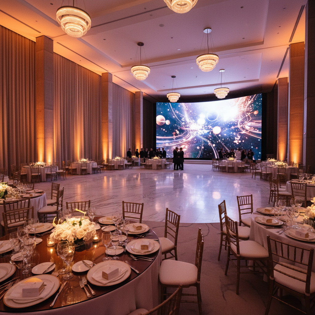 - Visual systems: LED video walls or high-lumen projection for content, monograms, and live feeds.